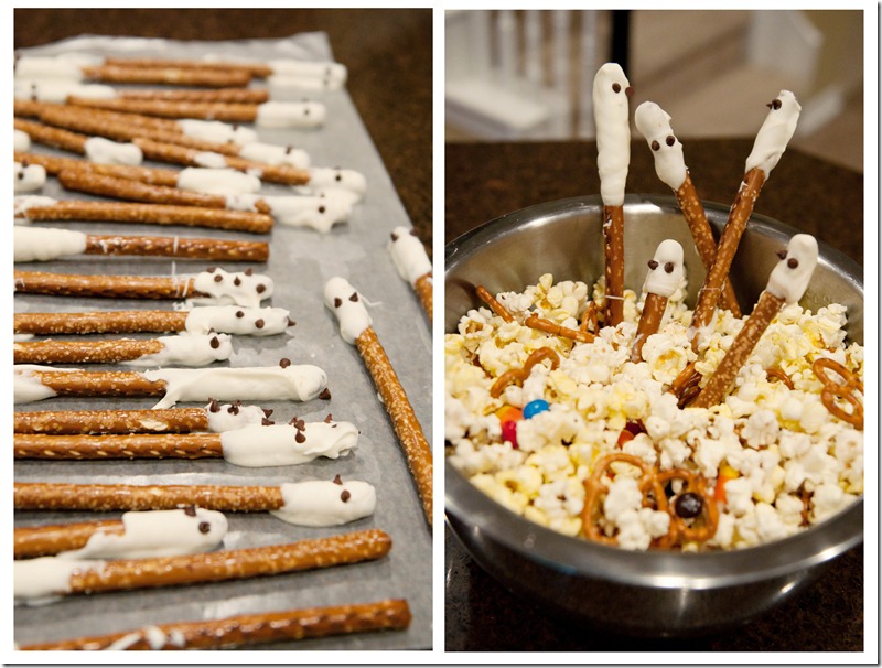 Before we started the movie we dipped pretzel rods in white chocolate and made ghosts.